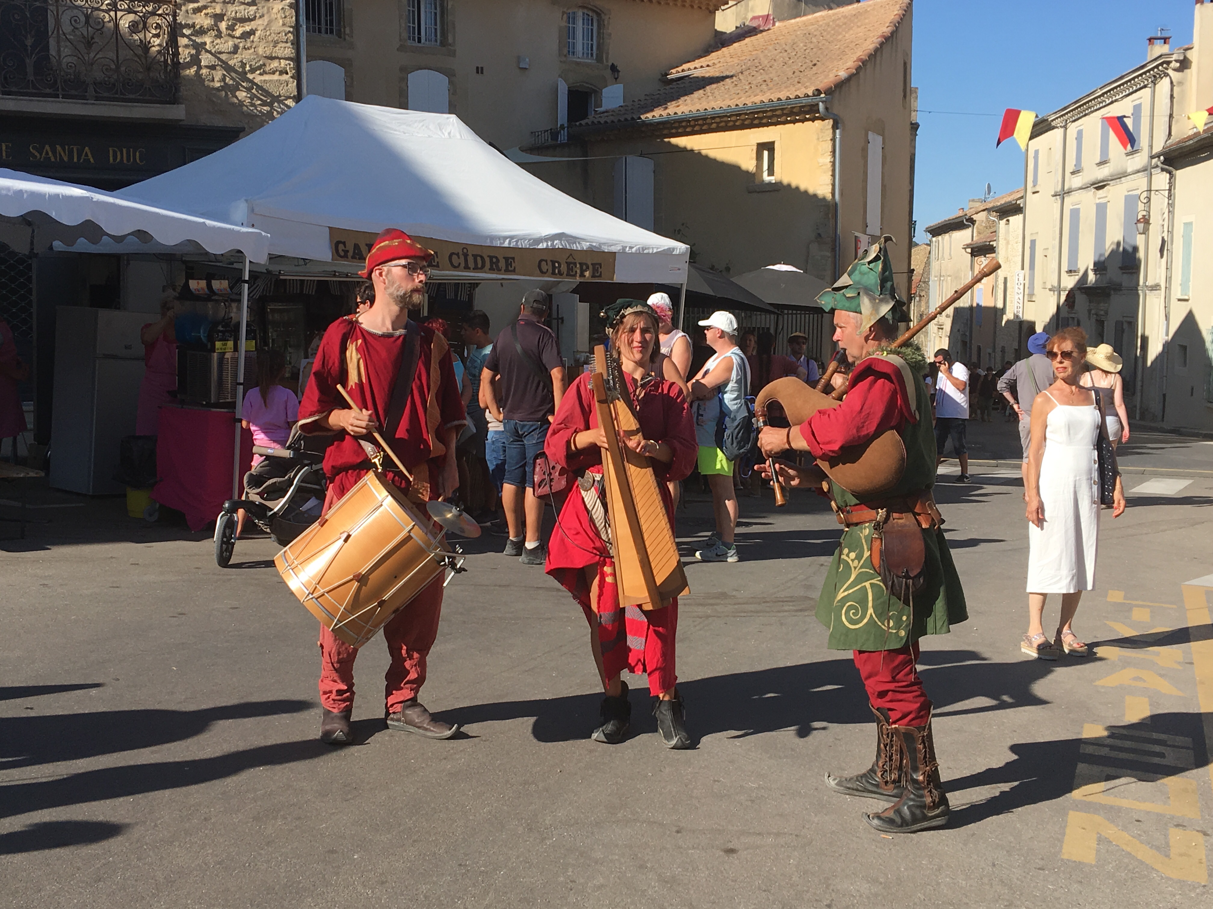 There was a medieval fete being held at Chateaunuef-du-Pape this weekend, so off we went. It was hot, no surprise, and the place was packed, so finding a carpark was not easy. in the wnd we parked on the footpath, like everyone seems to do here. A walk up the hill and then we were in a sea of tents, people in costume, sounds of early music (lots of drumming, no synths!) and food and drink for sale.