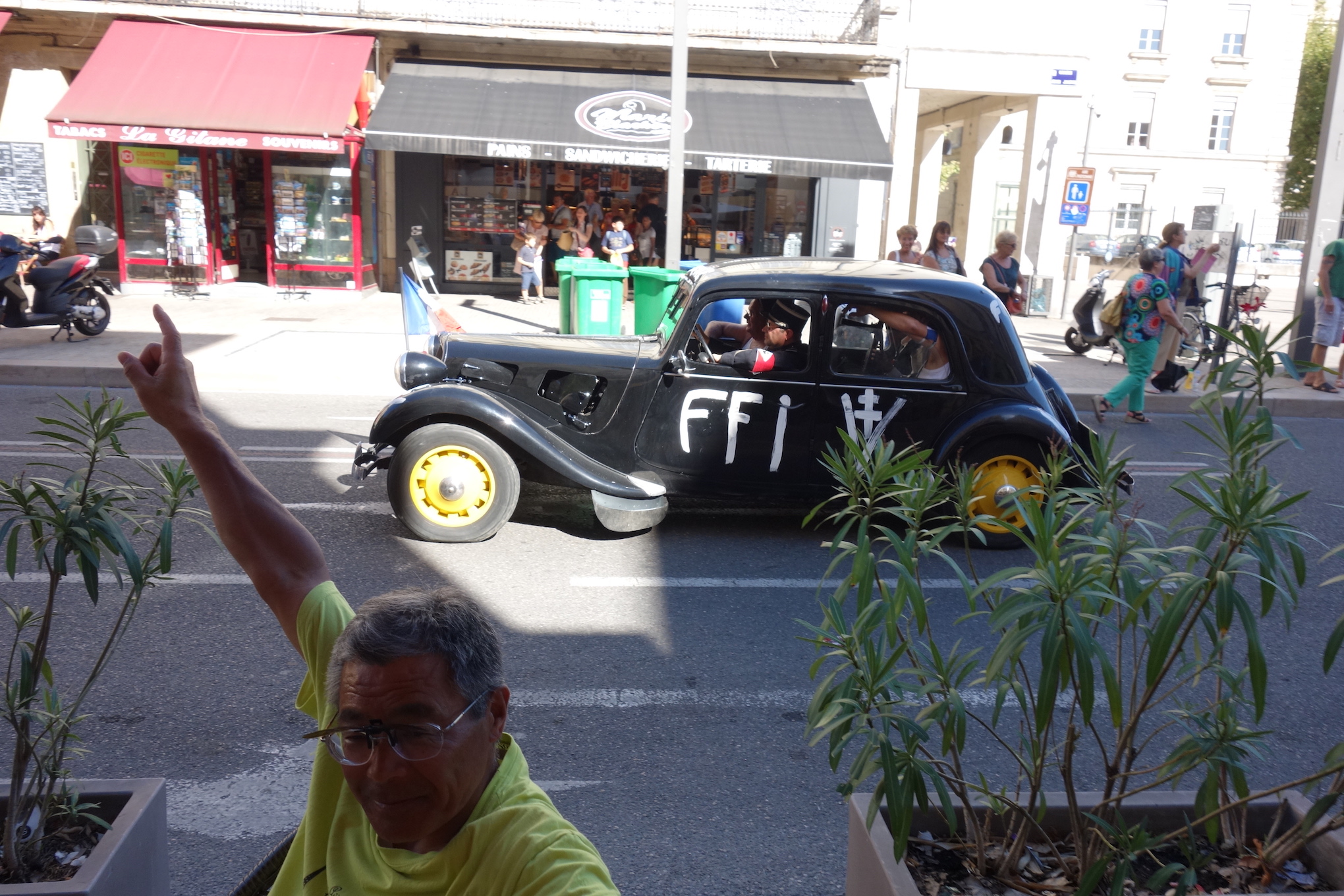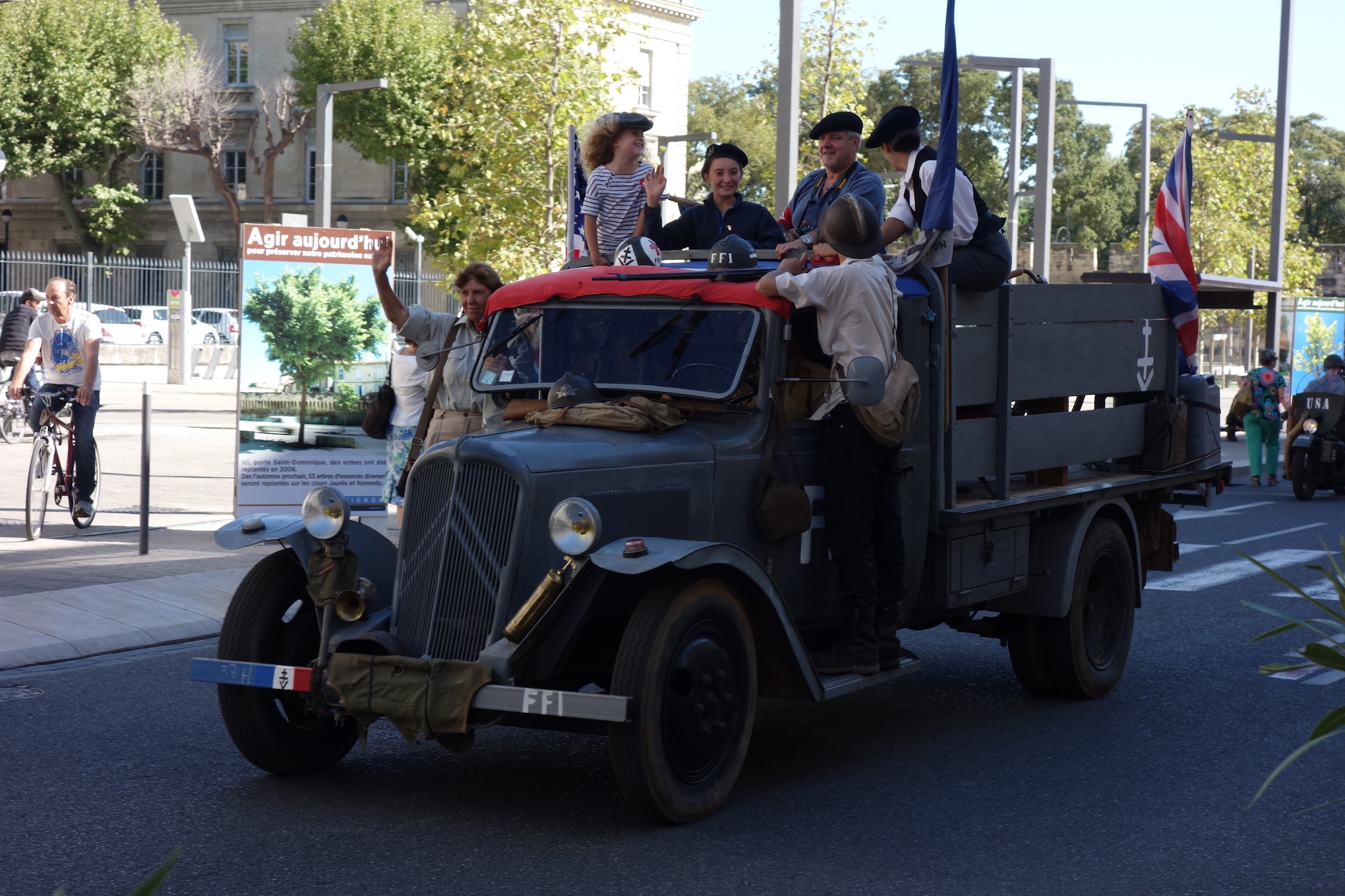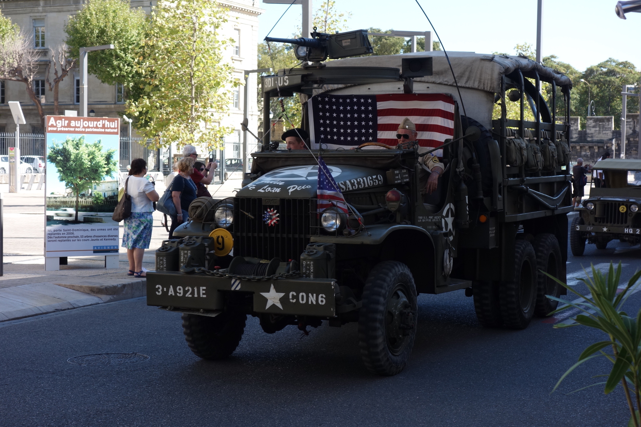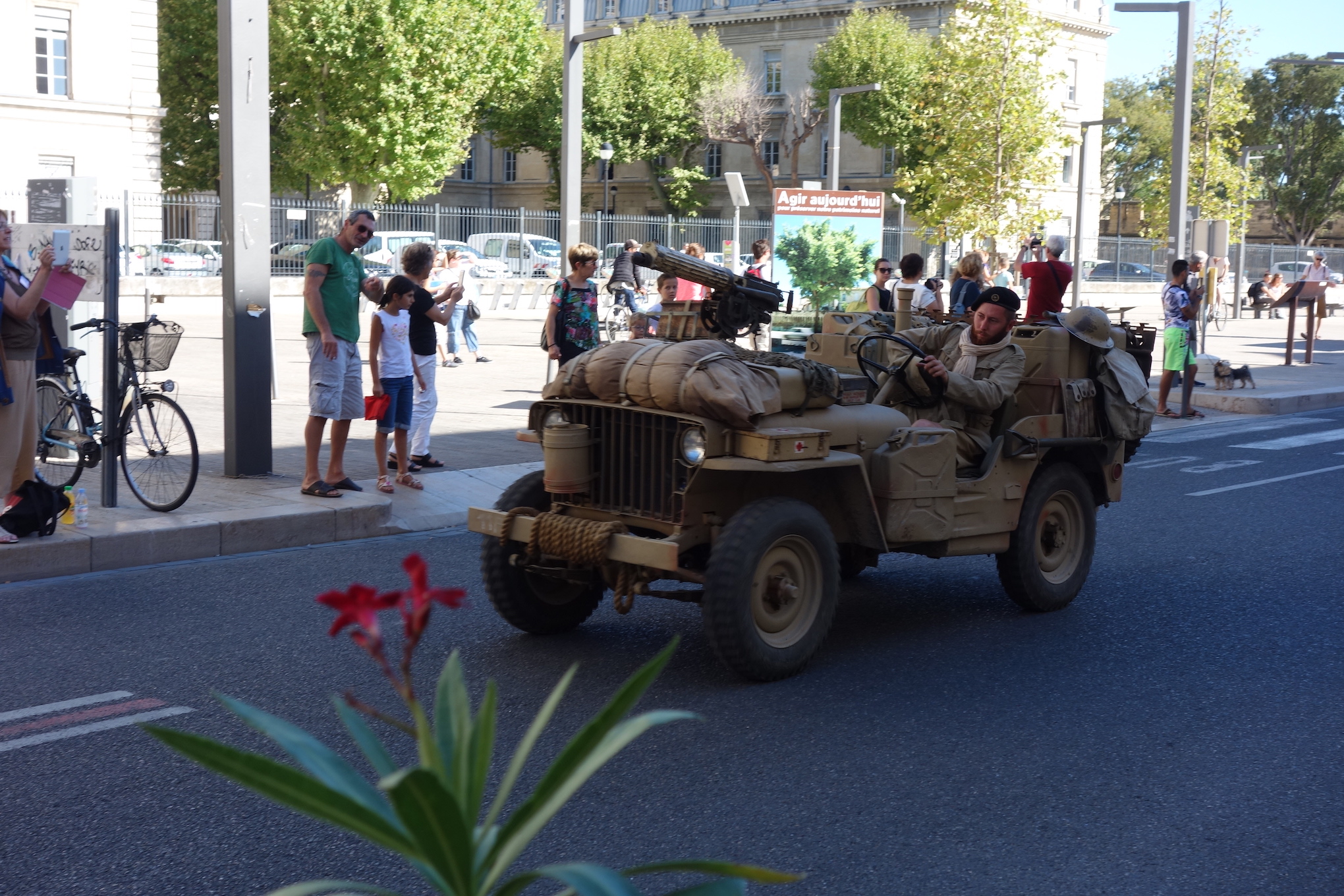 A few years ago I had been sitting in the same street watching a parade of vintage army vehicles and re-enactors, celebrating the anniversary of the Liberation in 1944. There was even a tank trundling along, as well as the obligatory black FFI Citroens and a few US Army jeeps with ‘GI’s slouched in them. I took a few shots of the parade back then.