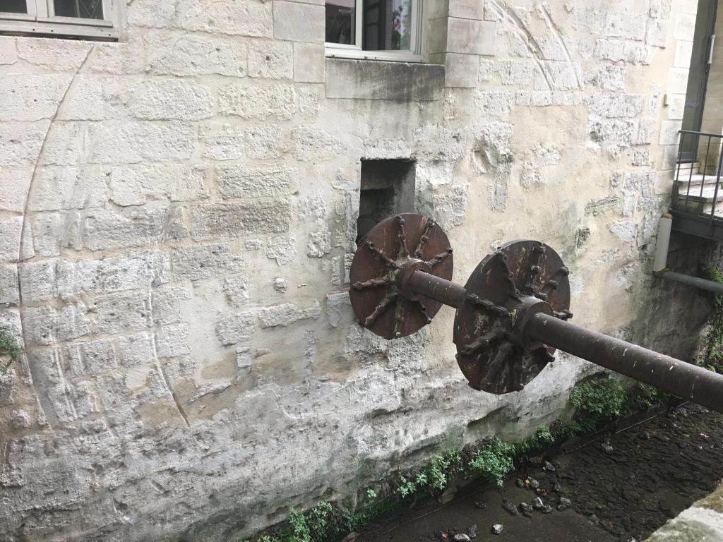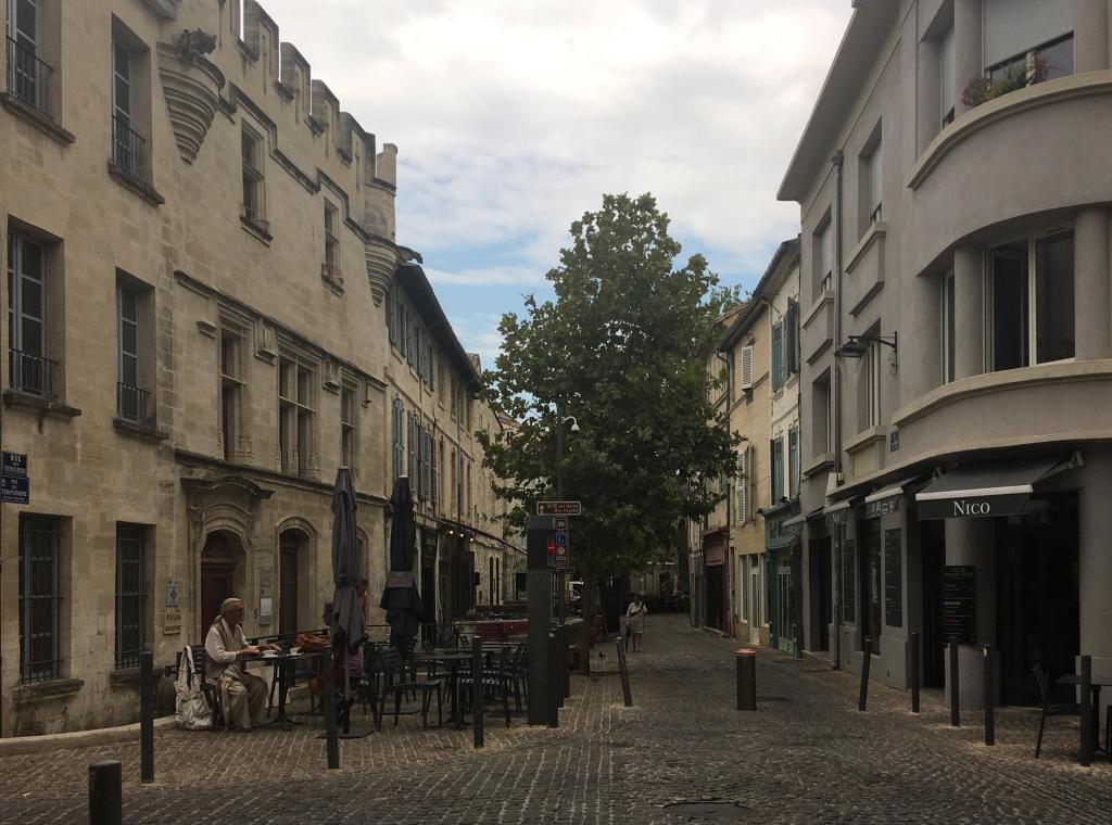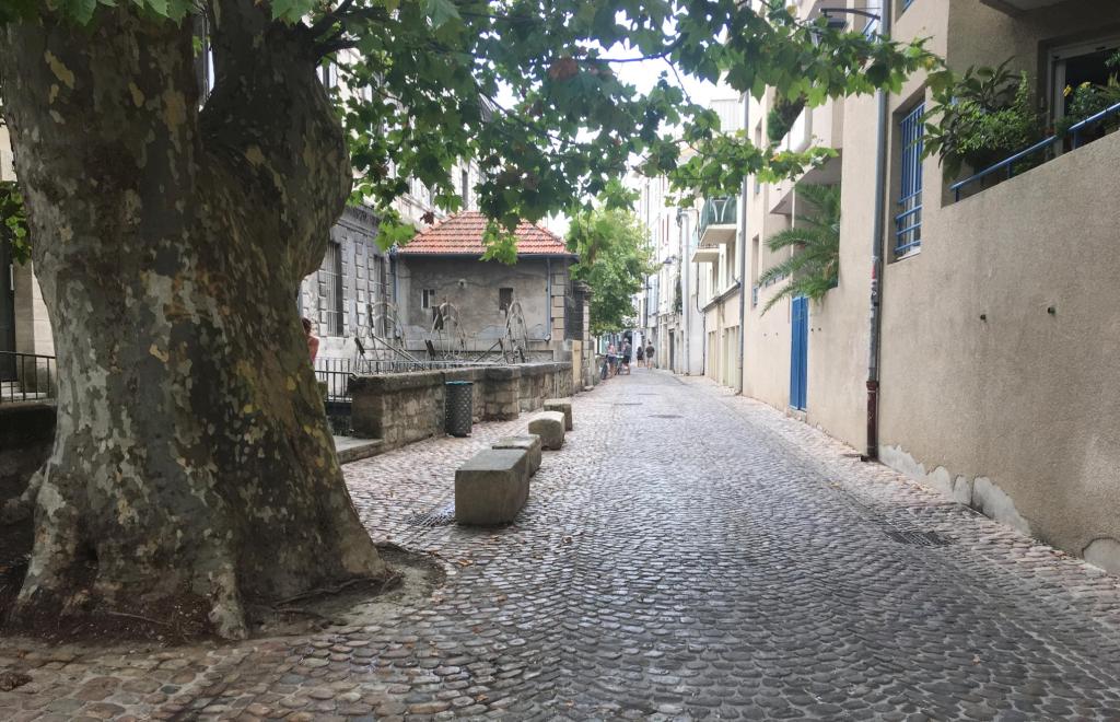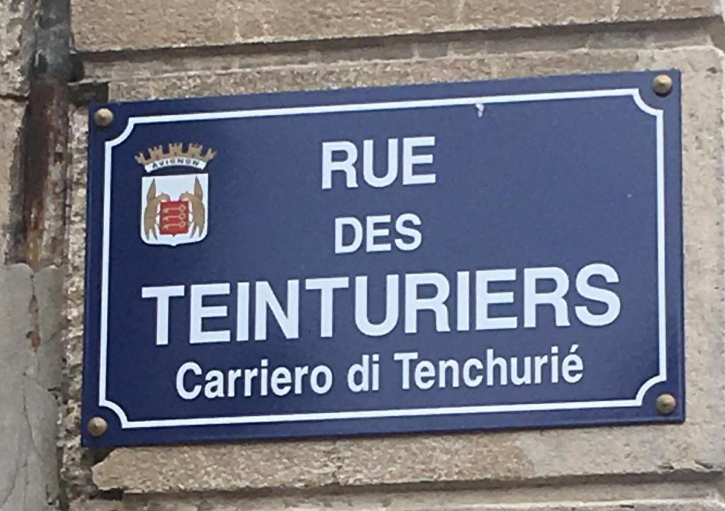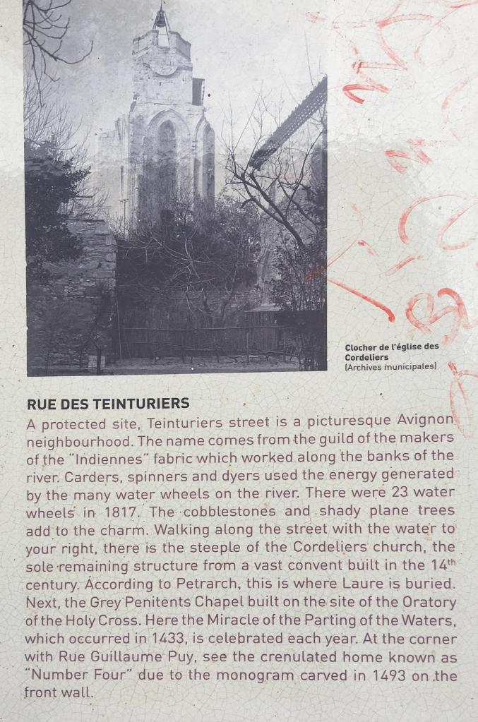 Rue des Teinturiers starts near the ancient city walls, at the point were the Sorgue enters the city under the walls. The Sorgue is a small river originating at the Fontaine de Vaucluse; in the 10th century and later water from the Sorgue filled the moats around Avignon. In the 14th century a textile industry developed in the area and waterwheels were built to supply power to the works. Later (16th c.) cotton printing and dying became the major industry and here is were the street got its name – teintur means dye or stain.